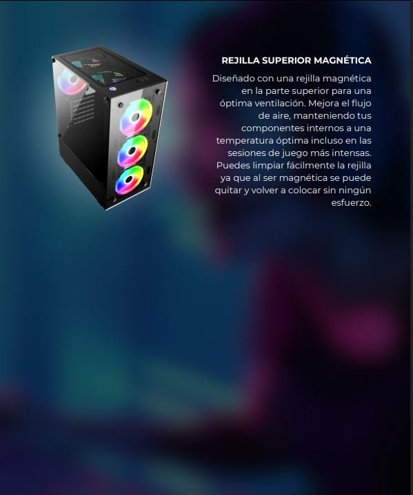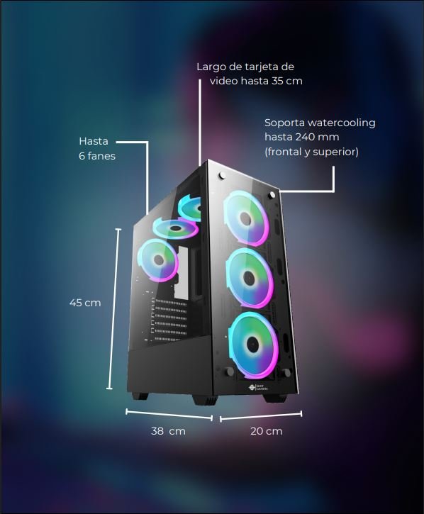 Ventilación: Soporta hasta 6 ventiladores (3 frontales de 12 cm, 2 superiores de 12 cm y 1 trasero de 12 cm)